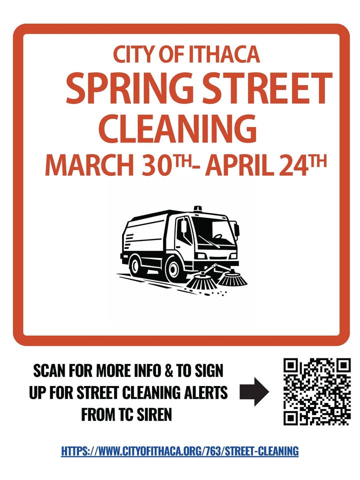 The Ithaca Department of Public Works will begin its annual Spring Street Cleaning on March 30 and run through April 24, 2026, with schedule details and alert sign-ups available on the city’s website and through TC SIREN.