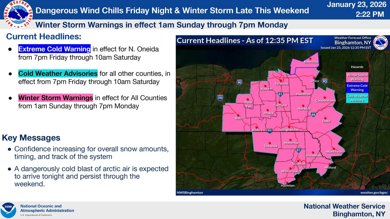 The National Weather Service in Binghamton, NY, issued the alert on January 23, 2026, at 2:22 PM, noting that an Extreme Cold Warning is in effect for northern Oneida County from 7 p.m. Friday through 10 a.m. Saturday and Cold Weather Advisories have been issued for all other counties for the same time. Additional Winter Storm Warnings are in effect for all counties from 1 a.m. Sunday through 7 p.m. Monday.